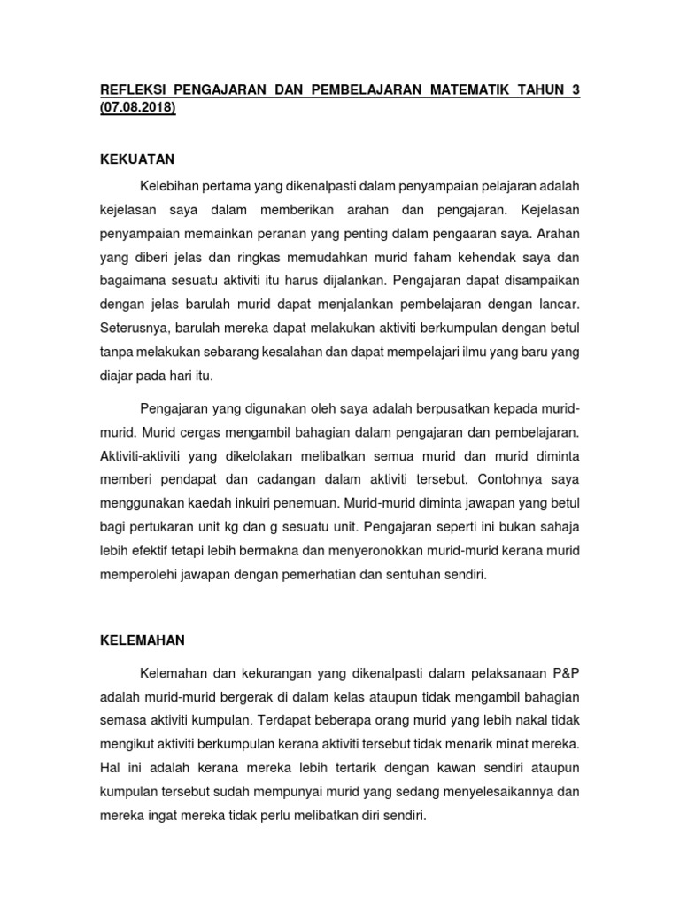 Refleksi pengajaran dan pembelajaran matematik. Matematik rph refleksi rancangan pengajaran harian 1 berat p1. Aktiviti pembelajaran seperti set induksi penerangan penyoalan tunjukcara variasi rangsangan peneguhan penggunaan gerak geri gerak isyarat sikap gesture dan perlakuan bukan lisan seperti senyum anggukan kepala dan gerakan tangan dan sebagainya akan menentukan. Pengajaran dan pembelajaran hari ini dapat dilaksanakan dengan lancar dengan adanya bantuan dan sokongan rakan rakan sekerja yang memberikan pertolongan memasang lcd dan sebagainya dalam hal saya menjalankan pengajaran dan pembelajaran tanpa apa apa sekatan di saat saat terakhir. Di samping itu saya juga dapat memperbaiki setiap kelemahan dengan tujuan untuk meningkatkan lagi mutu pengajaran dan pembelajaran agar objektif yang dirancang akan dapat dicapai.