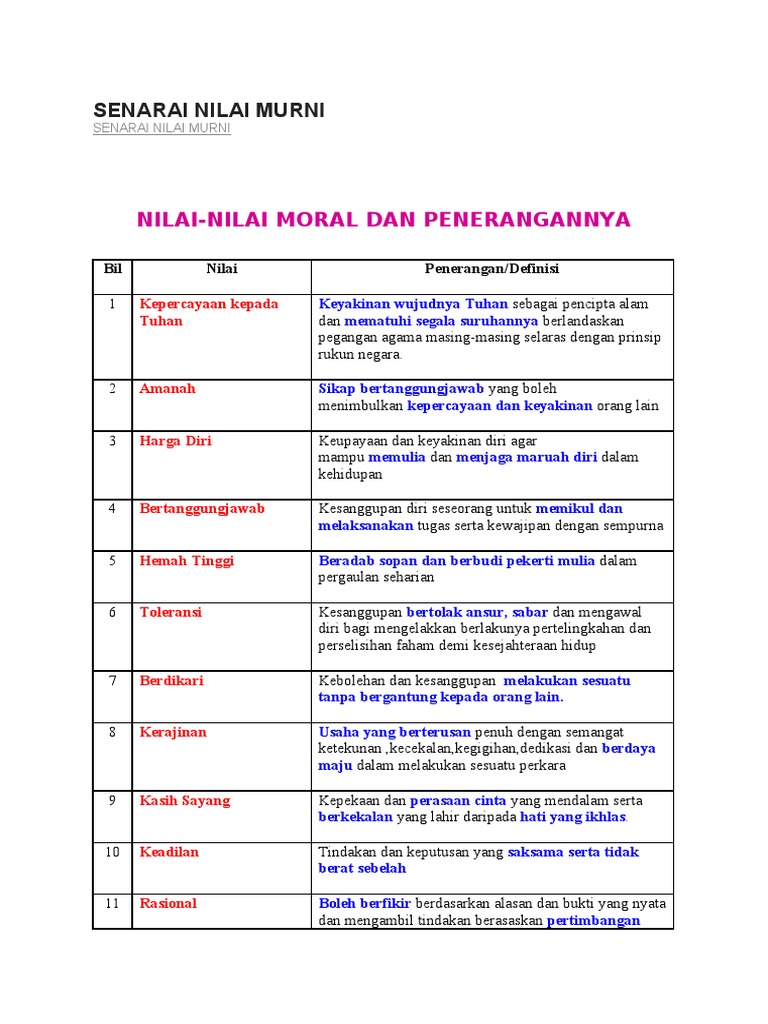 Senarai Nilai Nilai Murni Doc Document