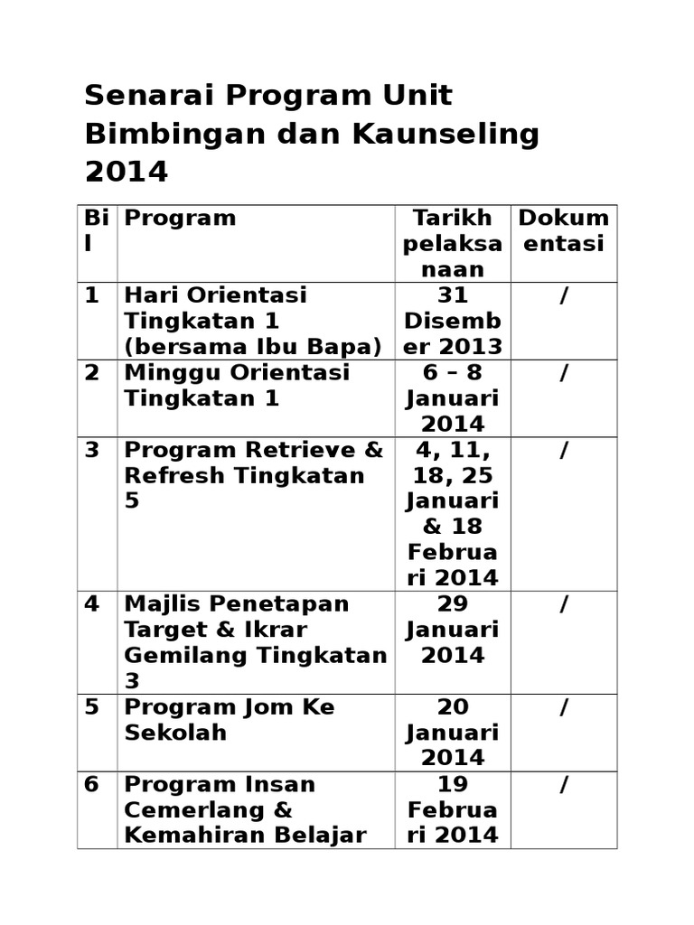 Senarai program unit bimbingan dan kaunseling. Soalan yang saya sering perolehi jika menjalankan kursus untuk guru kaunseling lantikan dalaman ialah bagaimana sistem fail yang sepatutnya mereka wujudkan. Mengenalpasti keperluan perkhidmatan bimbingan dan kaunseling sekolah melalui kajian keperluan soal selidik temu bual dan perbincangan dengan murid guru pentadbir kakitangan sekolah ibubapa dan bekas murid. Sehingga 9 00 pagi tempat program dijalankan. 4 mengumpul menyelia menyebar maklumat bimbingan dan kaunseling kepada semua murid melalui sebarang media yang sesuai.