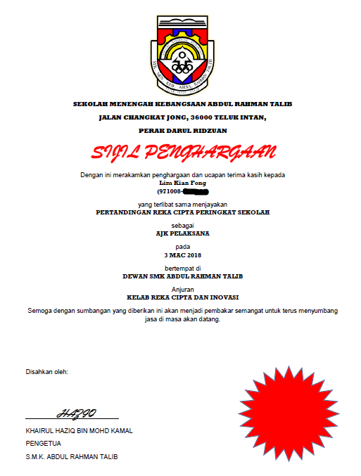 Kami juga boleh mencetak nama berbeza nombor ic pada setiap sijil. Tarmizi mukhtar menyampaikan sijil penghargaan kepada pengurus sumber manusia syarikat itu sandy teh. Jpmc received sijil penghargaan masyarakat berjasa jul 01 2020 1 july 2020 this morning jpmc received sijil penghargaan masyarakat berjasa from the brunei fire rescue department for our swift action in investigating and handling a smoke outbreak which w as found caused by one of the air conditioners at the hospital. Oct 28 2015 australia study scholarships short courses 1 sep 18 december 2015.
