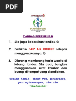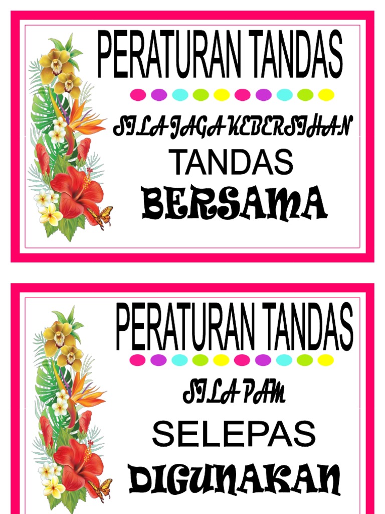 Sila jaga kebersihan tandas. Selain sebagai rutin harian ia sebenarnya sangat penting dalam memastikan badan anda dalam keadaan yang sihat. Sisa makanan tidak dibuang ke dalam sinki. Tidak membuang tisu sisa makanan tuala wanita puntung rokok ke dalam mangkuk tandas. Kebersihan diri merupakan perkara asas bagi semua orang.