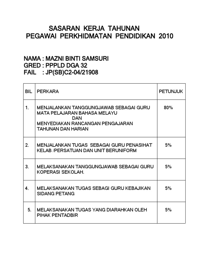Pegawai yang dinilai pyd mempunyai sasaran kerja tahunan skt yang tela h dipersetujui bersama. Penetapan sasaran kerja tahunan pyd dan ppp hendaklah berbincang bersama sebelum menetapkan skt dan petunjuk prestasi. S4040 40 contoh sasaran kerja tahunan skt s4141 41 sasaran kerja tahunan contoh pengisian sasaran kerja tahunan dan laporan pencapaian bil. Malah ia juga boleh dijadikan rujukan untuk membina karangan dan menambah perbendaharaan kata dalam bahasa melayu.