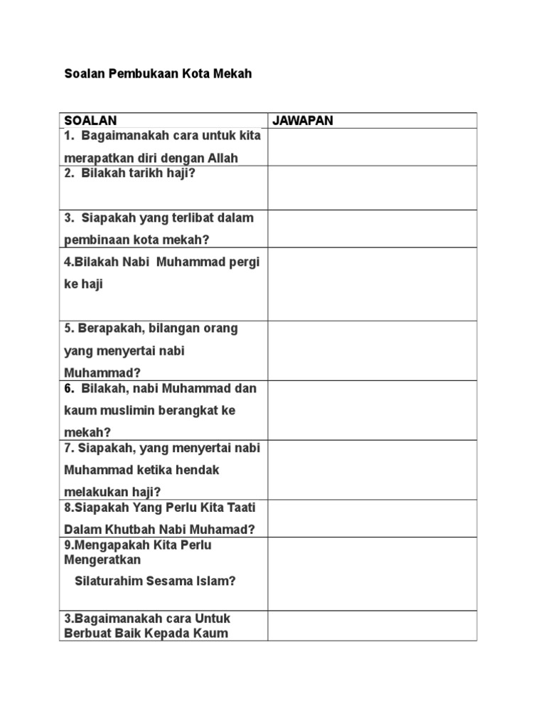 Koleksi soalan dan latihan pendidikan islam tahun 6 upsr jawapan. Tahun 6 pembukaan kota mekah draft. Posted on august 8 2018 august 9 2018 by pai tahun 6. 3 markah tajuk.