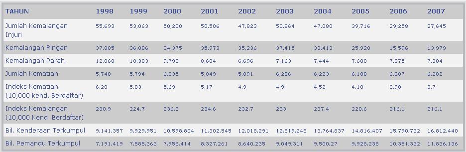 Sistem jalan raya sedia ada tidak dapat nak menampung jumlah kenderaan yang sedia ada ketika waktu puncak pergi kerja balik kerja. Statistik kemalangan umum 1997 2016. 1 16 jumlah kenderaan yang terlibat dalam kemalangan jalan raya mengikut jenis kenderaan malaysia 2006 2015 total motor vehicles involved in road accidents by type of vehicle malaysia 2006 2015 1 17 jumlah kematian disebabkan kemalangan jalan raya mengikut tahun dan negeri malaysia 2006 2015. Bengkang bengkok licin berlubang tiada papan tanda amaran kalau jalan rosak.