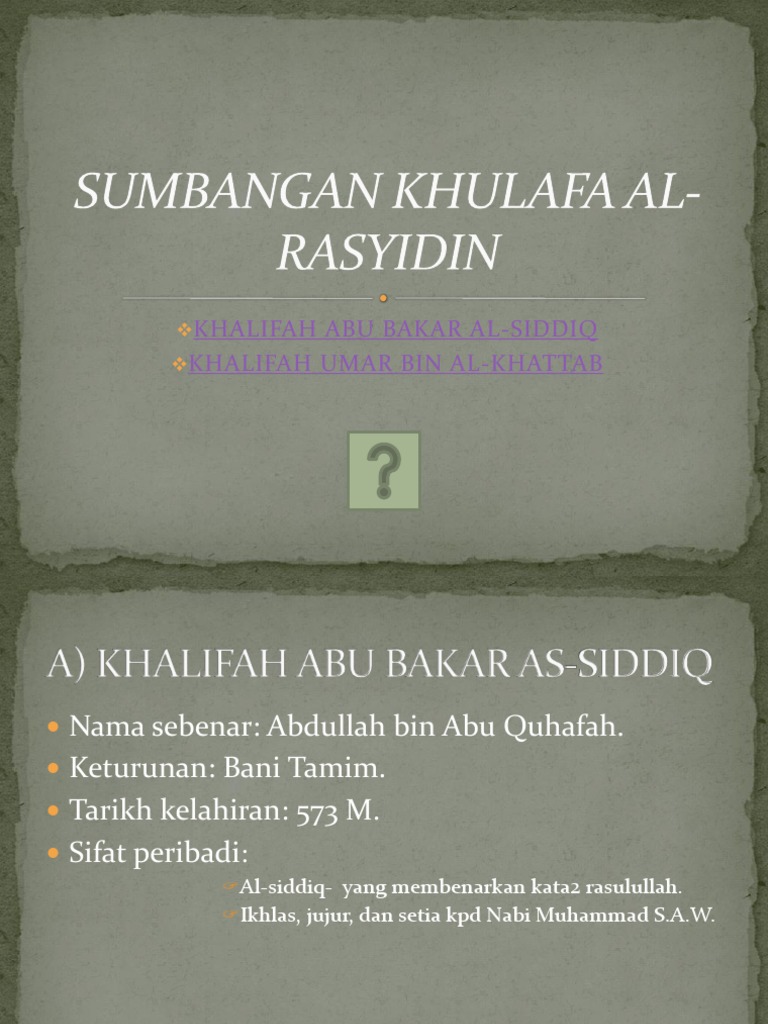 Sumbangan khulafa al rasyidin. Abdullah bin abu quhafah. Khulafa al rasyidin الخلافة الراشدة al khilãfah ar rãšidah merupakan yang pertama daripada empat khilafah utama yang ditubuhkan selepas kewafatan muhammad tampuk kepimpinan dipegang oleh empat khalifah pengganti muhammad selepas kewafatannya pada 632 m atau 11 h. Enggan menunaikan kewajipan solat. Dengan kewafatannya selesailah tugasnya sebagai pembawa.