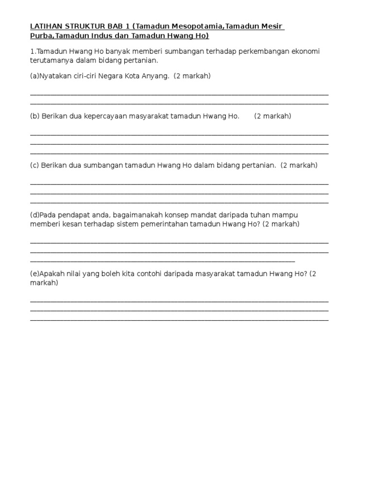 Tamadun awal china telah wujud kira kira 4500 tahun dahulu ia berlaku di sekitar sungai kuning atau hwang tamadun ini berkembang pesat pada zaman dinasti shang 1766 1122 sm atau 1523 1027 sm bandar utama yang muncul ialah anyang changan dan loyang anyang telah dijadikan ibu negeri dinasti shang. Tajuk fokus sejarah kertas 2 spm 2014 2012 19 october 2 september 11 april 4 march 2 2011 25 november 2 october 3 september 4 august 16. Tamadun hwang ho nyatakan ciri ciri tamadun hwang ho. Sumbangan tamadun hwang ho dari segi politik tamadun hwang ho telah mempengaruhi sistem pemerintahan china kuno sistem pemerintahan monarki telah diteruskan hingga ke zaman dinasti ching sedikit perubahan berlaku sahaja contohnya gelaran raja diubah kepada maharaja konsep anak syurga mandat dari syurga yang dikaitkan dengan raja dan amalan putaran dinasti diteruskan oleh dinasti dinasti di.