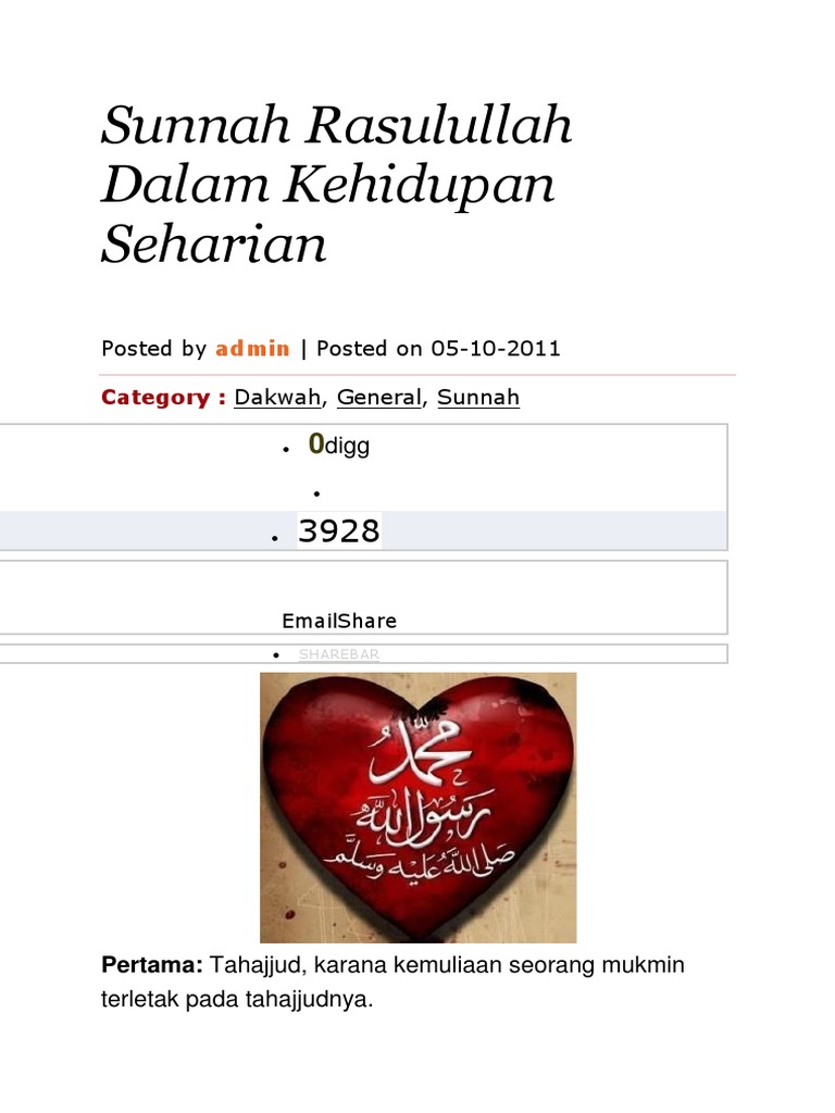 February 5 2013 february 6 2013 zulfakirana. 100 sunnah nabi dalam kehidupan seharian. Apa yang harus manusia kerjakan di waktu bangun tidur ketika dalam kehidupan bermasyarakat sehari hari sampai urusan privasi diatas ranjang semuanya sudah dijelaskan dalam sunnah rasul sehari hari. Selain memperoleh ganjaran dari allah swt mengamalkan sunnah nabi juga sudah terbukti dari segi saintifik bahawa ia amat baik untuk kesihatan dalaman dan luaran.