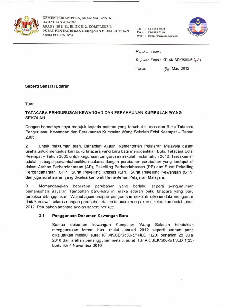 Tatacara pengurusan kewangan dan perakaunantatacara pengurusan kewangan dan perakaunan kumpulan wang sekolah tpkpkws kpm edisi 4kumpulan wang sekolah tpkpkws kpm edisi 4 2005 dan ralat tpkpkws kp 1602 900 a 1 sj62005 dan ralat tpkpkws kp 1602 900 a 1 sj6 jld ii 33 bertarikh 27 september 2007jld ii 33 bertarikh 27 september 2007 5 5. Mengenai tatacara pengurusan kewangan dan perakaunan kumpulan wang sekolah yang seragam. Pengurusan kewangan dan perakaunan kumpulan wang sekolah edisi keempat tahun 2005 untuk makluman tuan bahagian akaun kementerian pelajaran malaysia dalam usaha untuk mengeluarkan buku tatacara yang baru bagi menggantikan buku tatacara edisi keempat tahun 2005 untuk kegunaan pengurusan sekolah mulai tahun 2012. Meningkatkan akauntabiliti pengurusan sekolah.