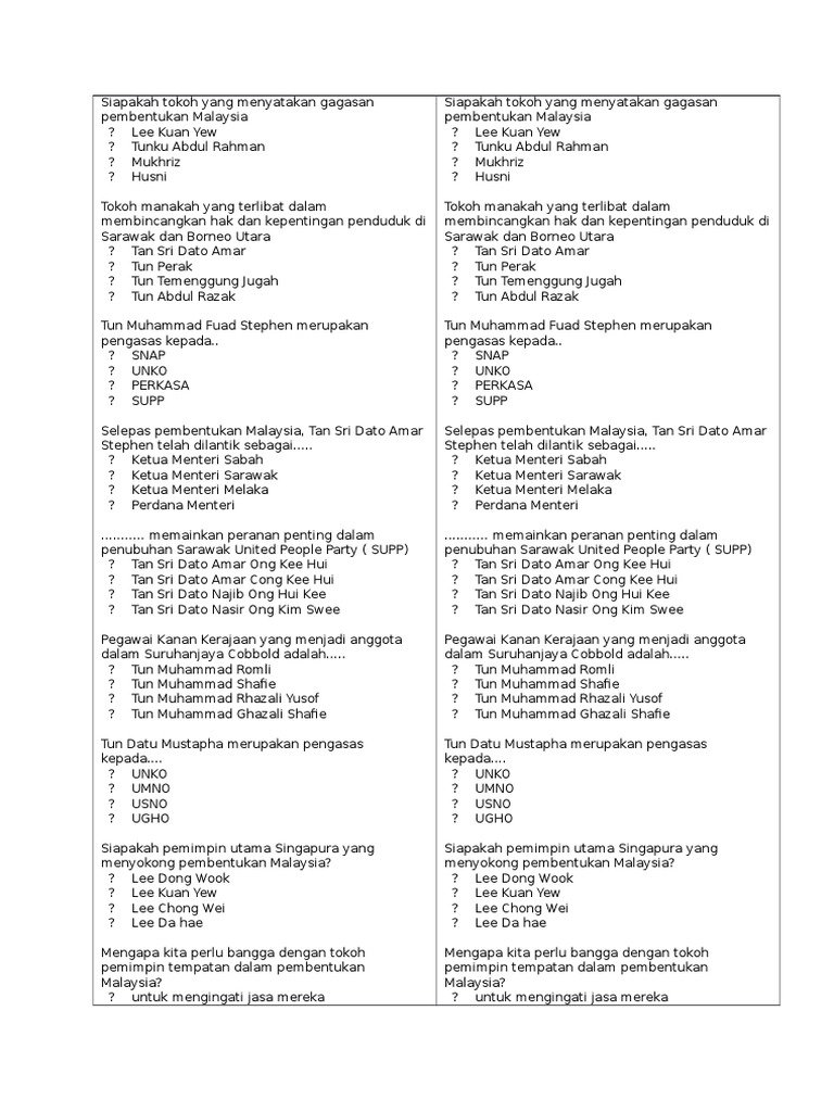Tokoh yang terlibat dalam pembentukan malaysia. Semasa tanah melayu menyambut kemerdekaan pada 31 ogos 1957 sarawak dan sabah bukanlah sebahagian daripadanya. Menghuraikan sebab sebab pembentukan malaysia dengan betul. Antara tokoh yang terlibat dalam proses pembentukan persekutuan malaysia ialah. Menyatakan 5 daripada negeri yang terlibat dalam pembentukan malaysia dengan betul.