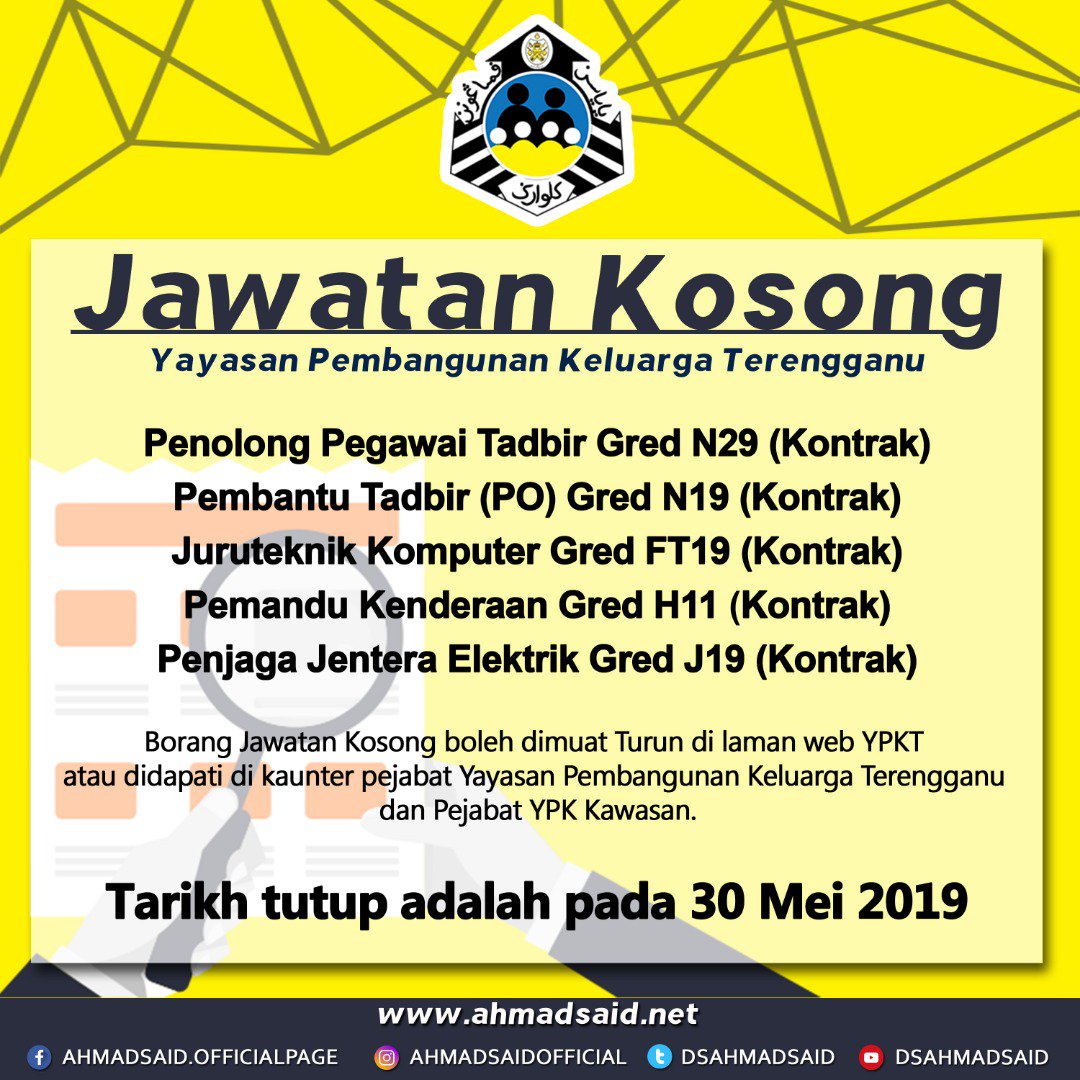 15 februari 2017 maklumat. Jawatan kosong di yayasan pembangunan keluarga terengganu ypkt kami mempelawa pemohon warganegara malaysia yang berumur tidak kurang dari 18 tahun pada tarikh tutup iklan yang berkelayakan dan memenuhi syarat syarat pelantikan bagi mengisi kekosongan untuk jawatan jawatan seperti berikut 1. Terengganu tarikh tutup permohonan. Juruteknik komputer gred ft19 kontrak 4.